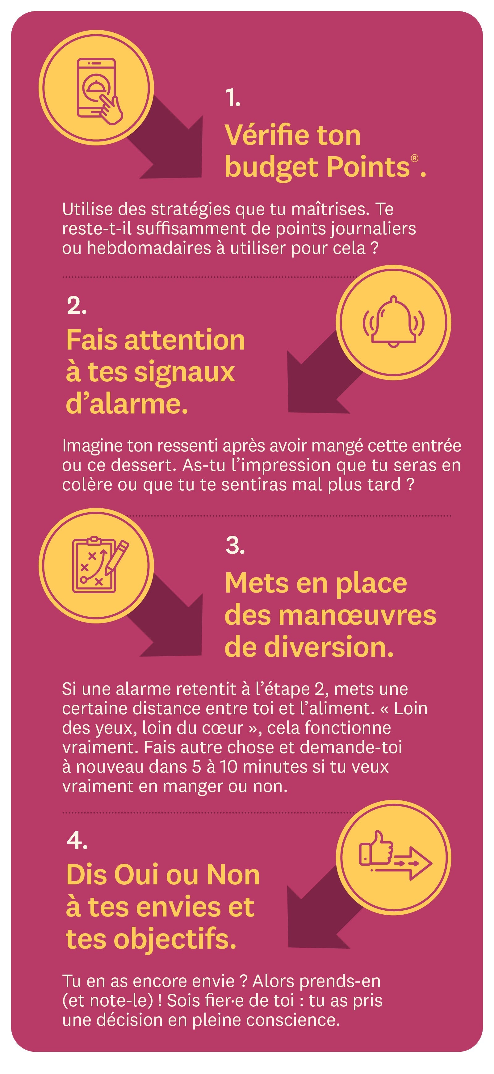 Même si tu as déjà planifié et noté les repas de la journée (comme un·e pro), les tentations imprévues peuvent te faire sortir du droit chemin. Nous mangeons en effet pour différentes raisons. Parfois, la faim physique, la faim hédonique et la faim qui arrive sous le coup d’une émotion, comme le stress, sont autant de raisons qui te poussent à grignoter. Soyons honnêtes : tu ne peux pas prévoir chaque aliment, chaque odeur, chaque publicité, chaque émotion que tu vas rencontrer au cours d’une journée. En revanche, tu peux planifier la façon dont tu voudrais réagir. Et c’est là que notre technique entre en jeu. Au lieu de simplement passer en pilote automatique et de manger, fais une pause pendant un moment et décide en pleine conscience ce que tu vas faire.