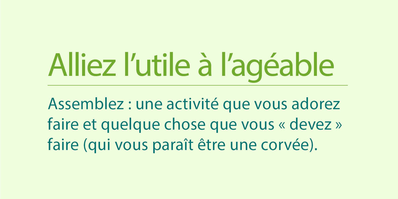Ensuite, assemblez une activité de chaque liste pour trouver des idées d'activités à la fois utiles et agréablespour vous, comme marcher en écoutant un podcast qui vous intéresse !
