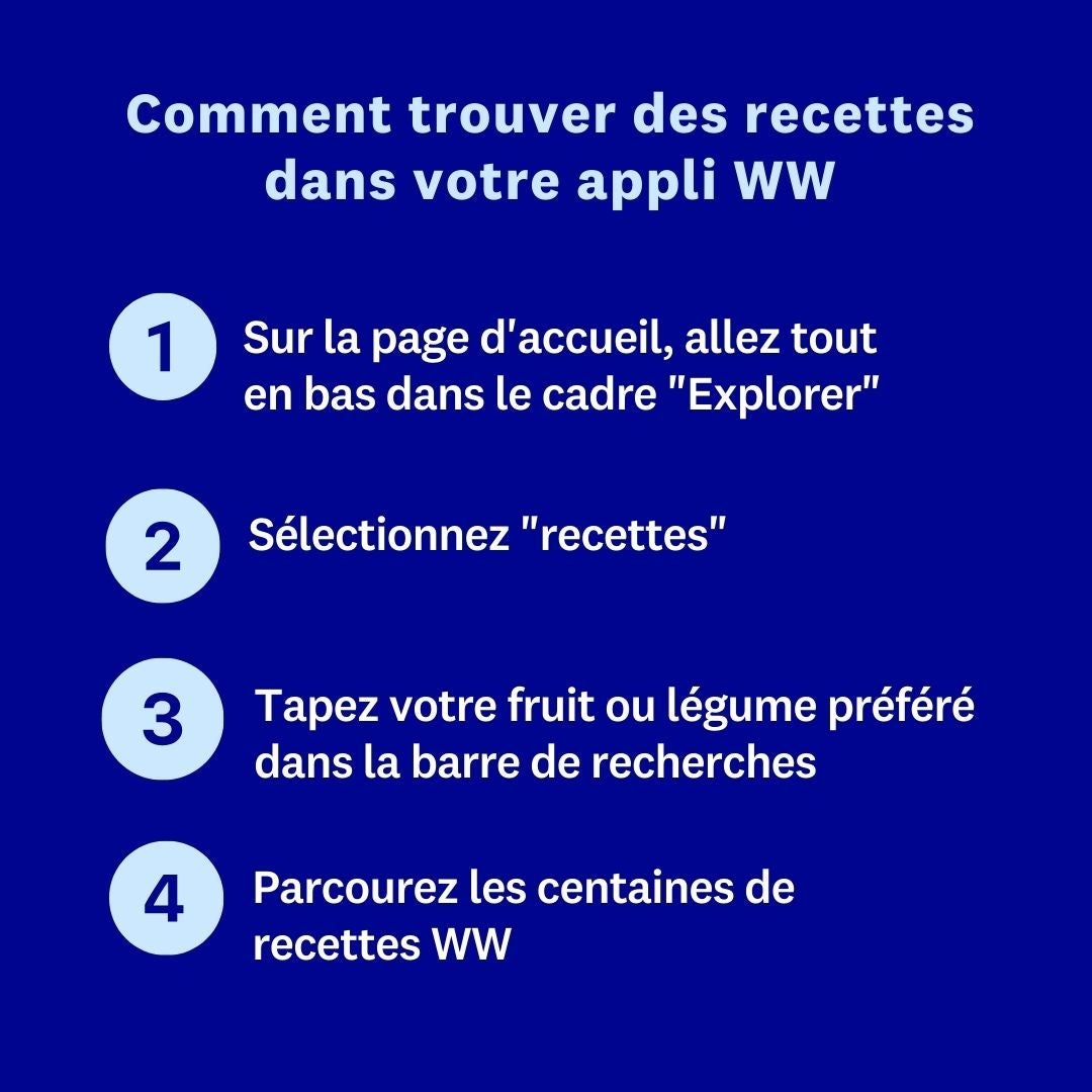 Et pour des centaines d’idées de recettes avec vos fruits et légumes préférés, rendez-vous sur votre appli WW pour de délicieux plats à faible valeur PersoPoints !