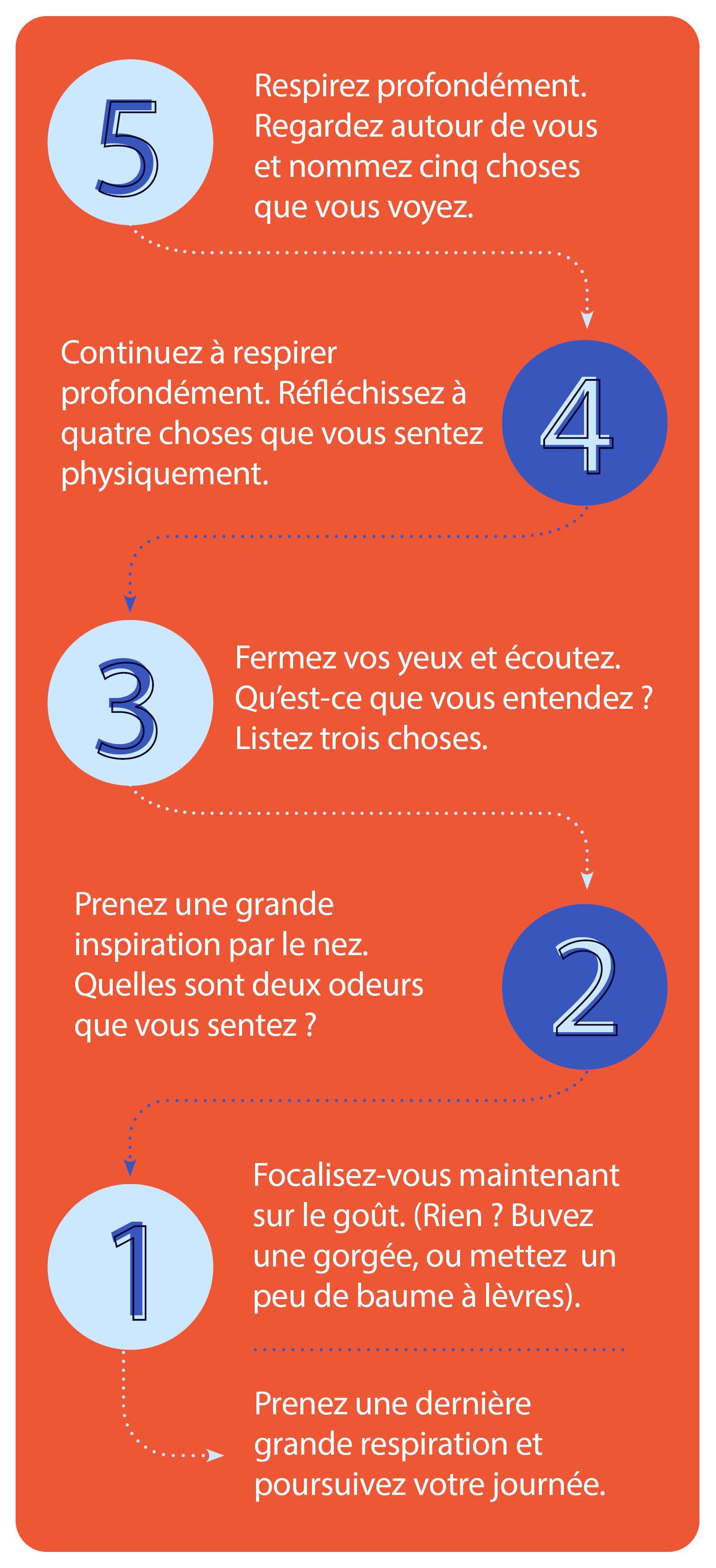 Le battement de votre cœur s'accélère, les paumes de vos mains deviennent moites, vous vous sentez dépassé par les événements... Bref, vous êtes passé en mode « stress ». C'est le moment de prendre une pause et de vous ancrer dans le moment présent avec la technique 5-4-3-2-1 !