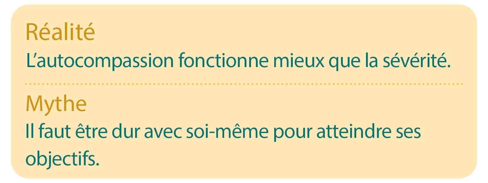 Mais ne vous inquiétez pas si ce changement ne se fait pas du jour au lendemain ! Il faudra entraîner vos muscles d'autocompassion plusieurs fois avant que cela devienne automatique. Commencez déjà par prendre conscience de la manière dont vous vous parlez (ainsi qu'aux autres), afin de commencer à faire preuve de plus de compassion envers vous-même petit à petit.