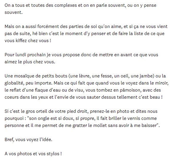 Faites une liste des trois parties de votre corps que vous aimez - créez par exemple une affirmation sur le rôle indispensable d'une de ces parties (« mes jambes m'emmènent où je veux ! »).