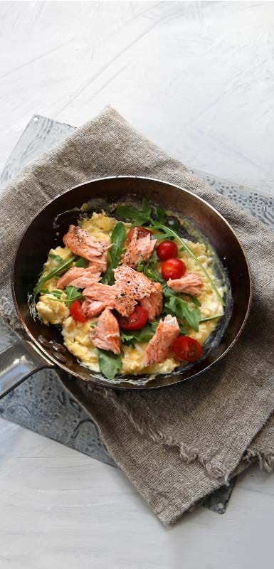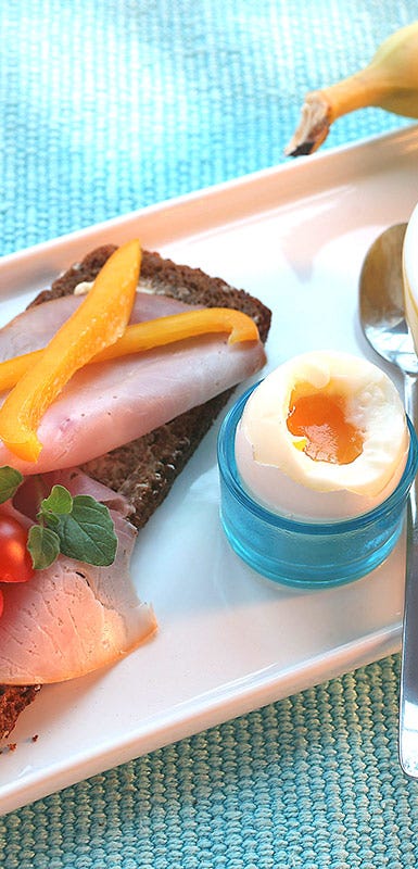 När vi hör “äggsmörgåsar” tänker nog de flesta av oss att äggen är fyllningen. Men vi har en annan idé. Äggen kan nämligen vara “brödet”. Du kan till exempel göra ett lyxigt mellanmål genom att dela ett kokt ägg. Lägg sedan en skiva tomat och en skiva stekt kalkon på ägghalvan innan du lägger på den andra ägghalvan, stick i en tandpetare så håller det hela ihop. Eller stek ett ägg och använd det som “toast”, lägg då ett stekt ägg på en tallrik, lägg på sallad, rökt lax, en skiva tomat och krasse. Ägg funkar alltså precis lika bra som bröd.
