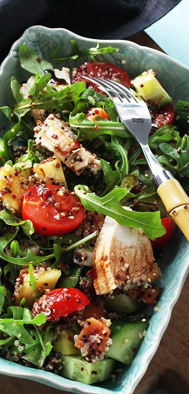 Sallad med quinoa, linser eller pasta kan du enkelt äta med bara gaffel ur en glasburk. Skär ingredienserna gaffelvänliga i bitar. Här tar du vad du har, eller låter dig inspireras av vår tropiska quinoasallad nedan!