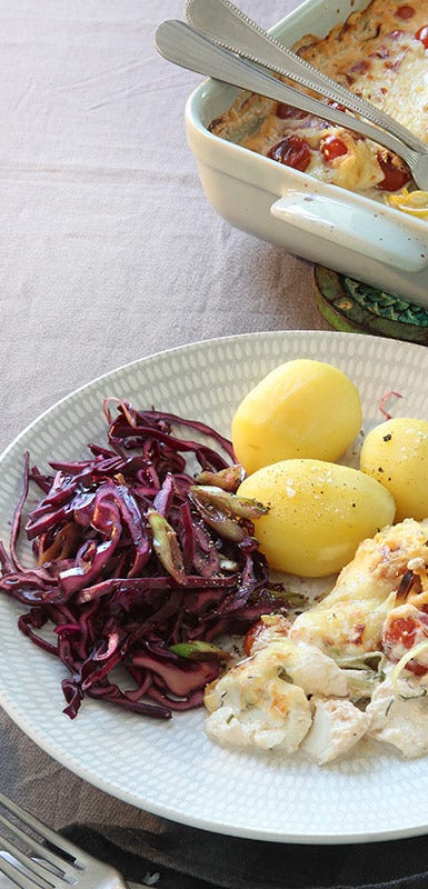 Enkel fiskgratäng med ljuvlig sås där smakerna gifter sig fint med varandra. Fyll upp tallriken med en krispig rödkålssallad.