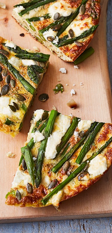 Lyxig frittata med chèvre, sparris, lök, dill, citron och pumpafrön. Så gott!