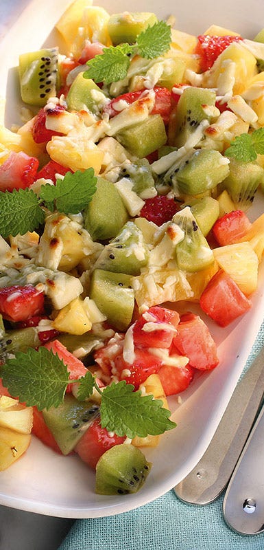 - Trä upp jordgubbar, kiwi och mango på cocktailpinnar.