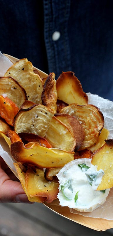 Skär rotfrukter i tunna skivor. Pensla med olivolja och rosta i ugnen på 200 grader tills de blir gyllene. Låt rinna av på hushållspapper och salta lätt.