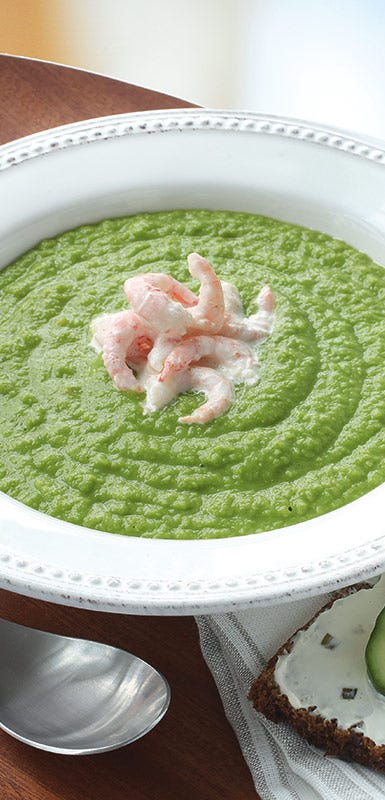 Vintern är tiden för långa mysiga sittningar vid middagsbordet med vännerna! Bjud på en grön ärtsoppa med räkor och pepparrotstopp som förrätt.