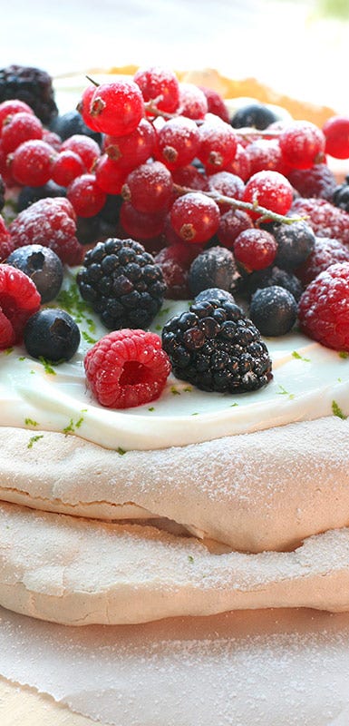 Fördela 200 g creme fraiche över en tårtbotten av maräng. Toppa med 200 g björnbär och 2 tsk siktat florsocker, dekorera med färsk mynta.