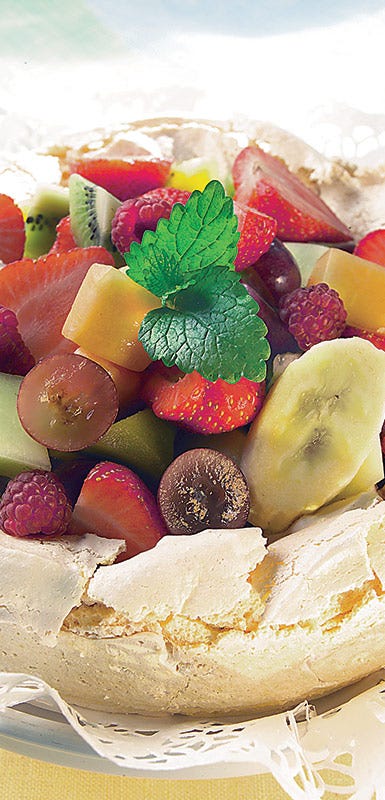 Vispa ner 1 rågad tsk lemon curd i 150g grekisk yoghurt, fördela på de 4 jumbomarängerna. Toppa med 1 liten, hackad mango och kärnorna från 2 passionsfrukter.