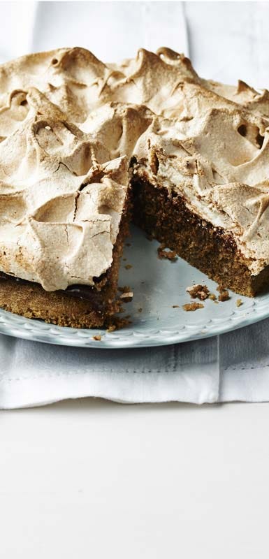 Blanda ihop 100 g mascarpone och 75 g kvarg. Tillsätt innehållet från 1 vaniljstång, fördela över en tårtbotten av maräng. Toppa med 200 g pocherade plommon.