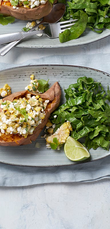 Bakad potatis (eller sötpotatis för den delen!) gör du snabbt i mikron. Stick några hål i potatisen och kör på högsta effekt i ca 10 minuter. Medan potatisen blir klar i mikron rör du ihop en fyllning.