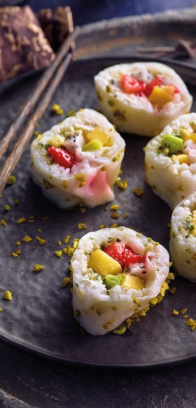Uramaki - Omvänd sushirulle där riset omger innehållet. Serveras ofta med topping, som såser, örter eller kryddor.
