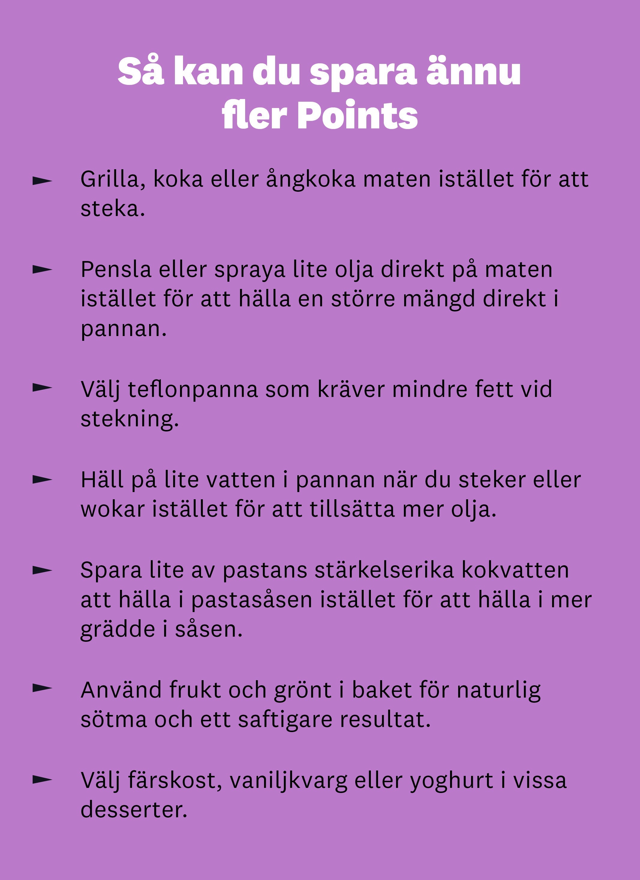 Att i förväg planera för hur du kan göra plats för maten du gillar och vill äta - antingen genom att sänka Pointsvärdet när du lagar mat och bakar eller genom att budgetera för varianter med höga Pointsvärden - gör din vikt- och hälsoresa mer hållbar och framgångsrik.
