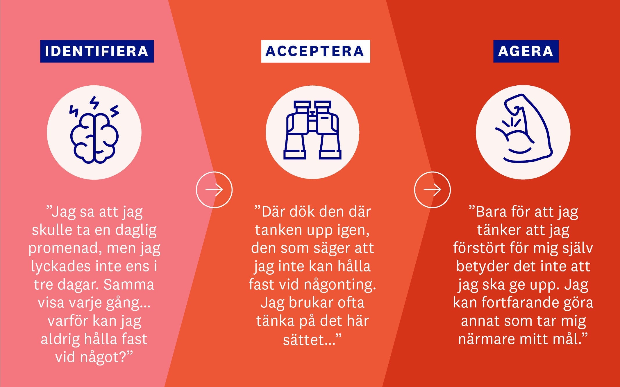 När vi sätter gränser handlar det om att prioritera det som är viktigt för oss (hjälpsamt!), men ibland får det oss att känna skuld (inte så hjälpsamt!). Hur kan vi undvika att fastna i känslan av skuld eller i andra ohjälpsamma tankar som hindrar oss från att nå våra mål? Jo, vi kan hantera dem genom att skapa distans mellan tanke och fakta så att vi kan acceptera dem och fortsätta vår väg framåt.