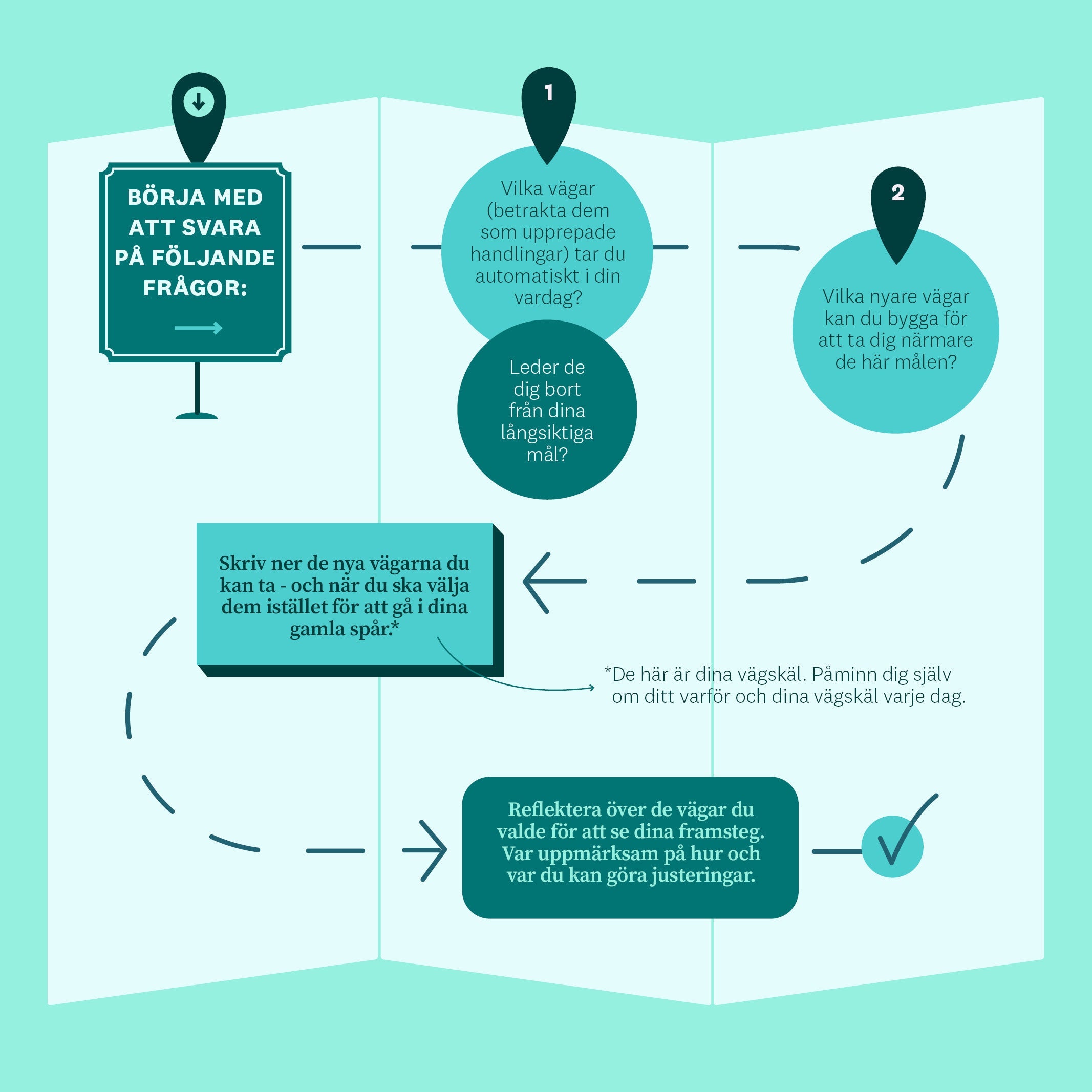 Låt oss säga att du brukar äta färdigrätter eller hämtmat när du har dåligt med tid, vilket händer ganska ofta. Men du har en dröm om att bli bättre på att laga mat. Att ta till de där färdiga måltiderna är en väg som kanske inte funkar för dig. En ny väg du skulle kunna bygga är: leta upp en handfull snabba recept som du kan svänga ihop hemma.