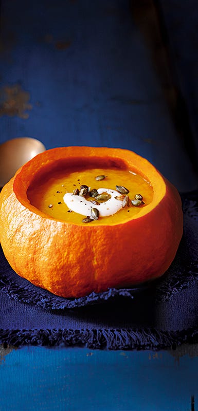 Kärna ut pumpan och karva ett läskigt ansikte. Förutom att rosta kärnorna och använda till yoghurt och sallad kan du också prova då en värmande, stärkande och god soppa till lunch (Se receptet lite längre ner). Läcker att servera i en urkarvad pumpa!