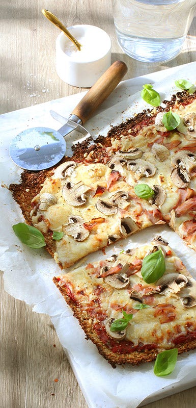 - Pizza med blomkålsdeg, måste testas! Toppingen kan du såklart välja själv, i vårt recept har vi valt den klassiska med champinjoner och skinka.