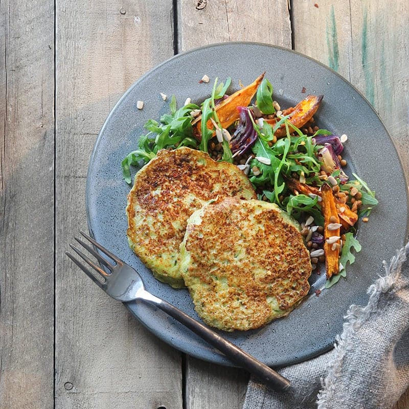 Blomkåls- och parmesanbiffar med gräslök och chili serveras med en matig och syrlig sallad gjord på sötpotatis och linser.