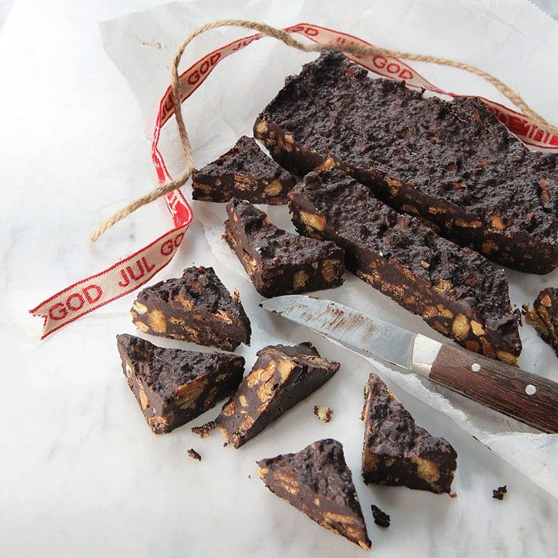 Låt stelna i kylen, ta bort plastfolien och dela i mindre trekanter.