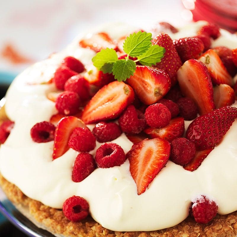 Sätt ugnen på 200°. Blanda samman margarin, havregryn, socker, mjöl och bakpulver. Tryck ut degen till en cirkel ca 25 cm i diameter på bakpappersklädd plåt. Grädda mitt i ugnen 12-15 min. Låt svalna. Vispa vaniljvispen och bred över tårtan, garnera med hallon, jordgubbar och citronmeliss.