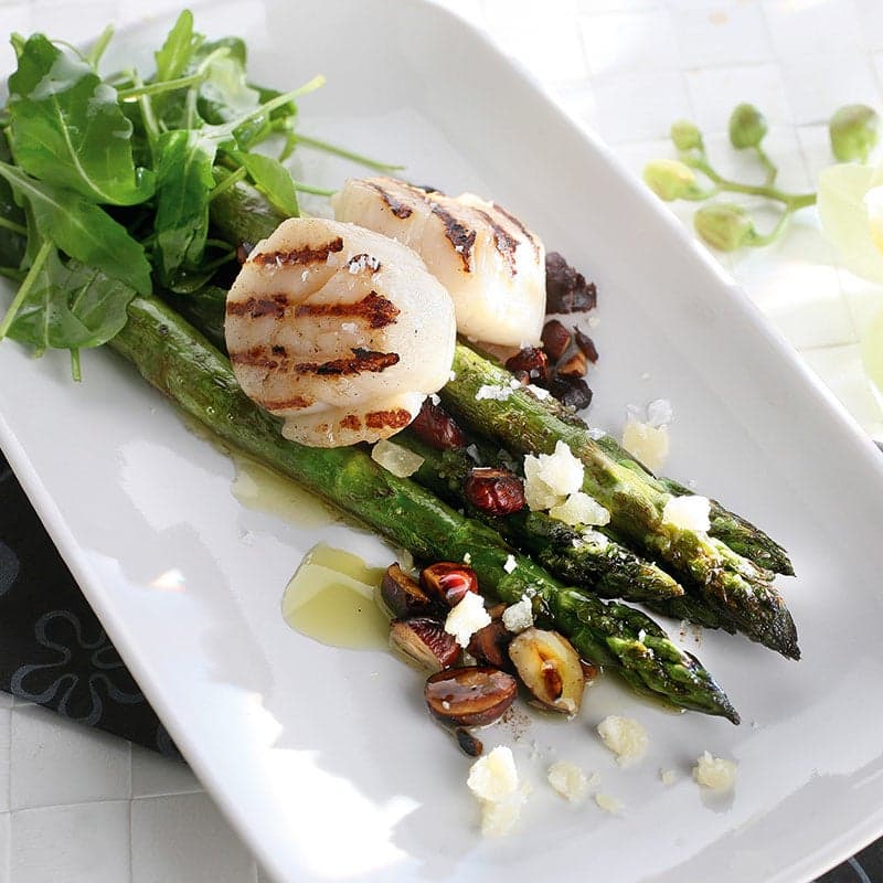 En förrätt som brukar falla de flesta i smaken. Grillade pilgrimsmusslor serverade på sparris och hasselnötter stekta i rapsolja och citron. Dessutom pepprig ruccola och nötig parmesan. En riktig publikfriare alltså.