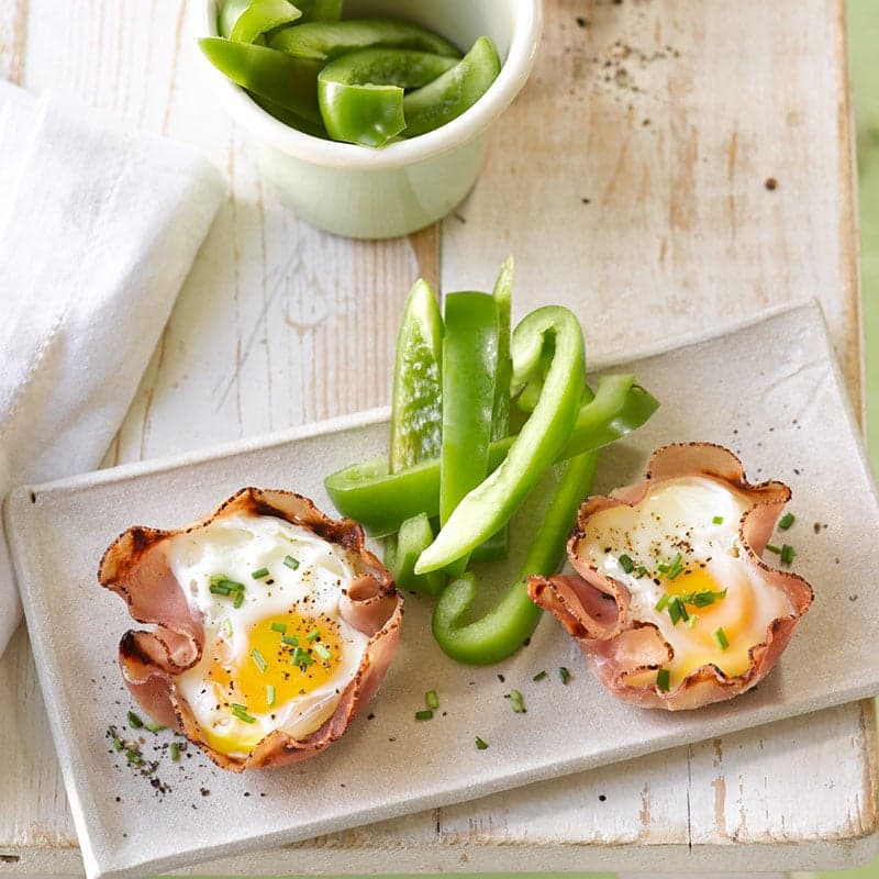 Täck två muffinsformar med varsin skiva skinka och knäck ner ett ägg i varje. Krydda med salt och peppar. Tillaga på 600 W i 3 min i mikrovågsugn. Strö över gräslök och strimlad paprika. Tips: Knytet kan även tillagas i ugn (ca 10 minuter i 180° C).