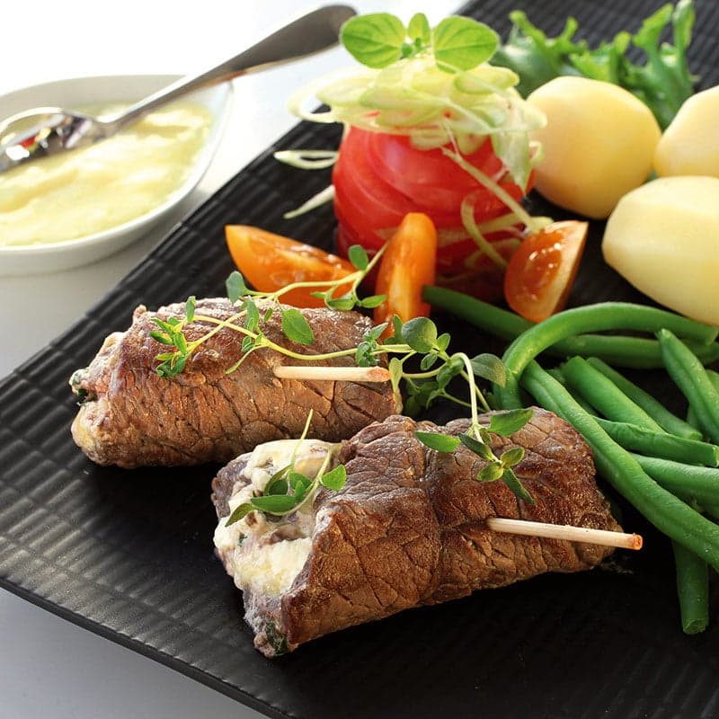 Lövbiff med härlig fyllning av färskost, basilika och vitlök. Serveras med potatis, sås, haricots verts och coctailtomater.