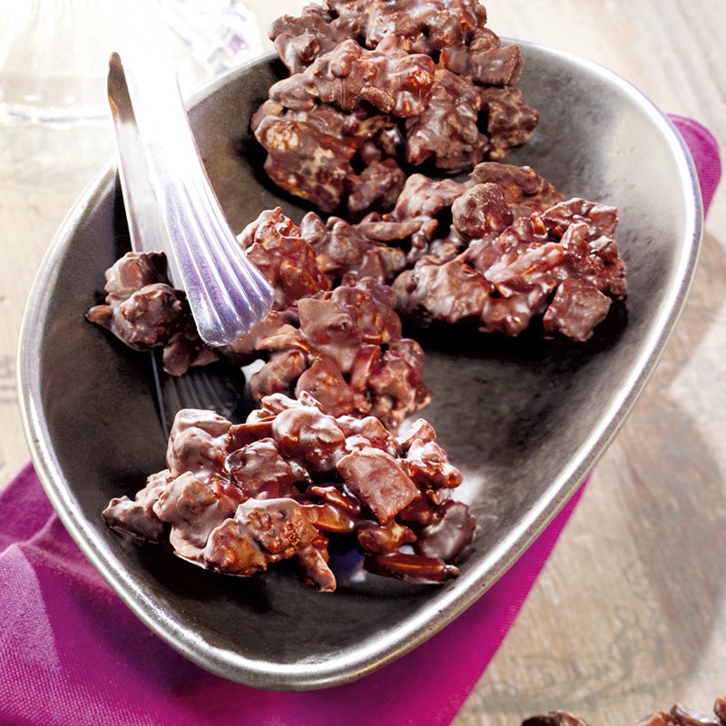 Bryt choklad i mindre bitar och smält över vattenbad. Finhacka bars och blanda med riskakor, mandel och smält choklad.