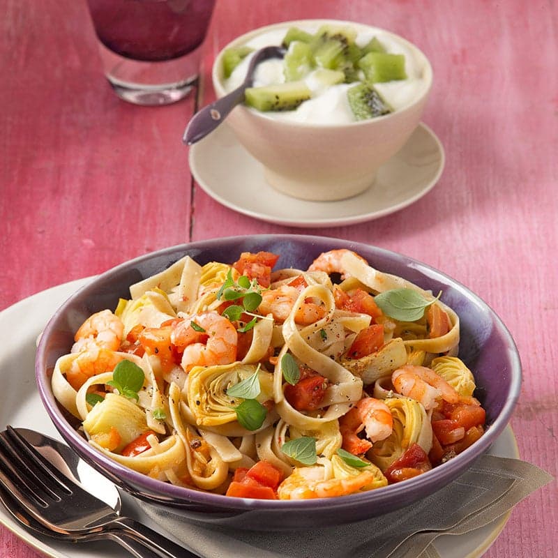 Koka pastan. Hacka tomat och lök. Låt kronärtskockshjärtan rinna av och dela i 4. Hetta upp olja och fräs lök och pressad vitlök. Tillsätt tomat och kronärtskockshjärtan och låt det sjuda på svag värme ca 10 min. Lägg i räkorna och smaka av med salt, peppar, citron och örter. Servera med pastan. Tärnad kiwi och yoghurt till dessert.