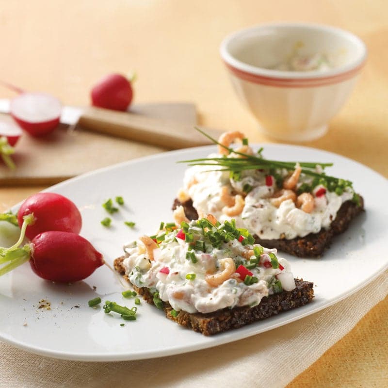 Finhacka rädisorna. Blanda samman yoghurt och kvarg, krydda med salt och peppar. Tillsätt räkor, rädisor och gräslök. Smaka av med pressad citron, salt och peppar. Bred salladen på brödet och servera.