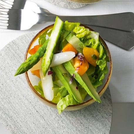 Blanda sparris, avokado, nektarin och lök med sallad i en skål.