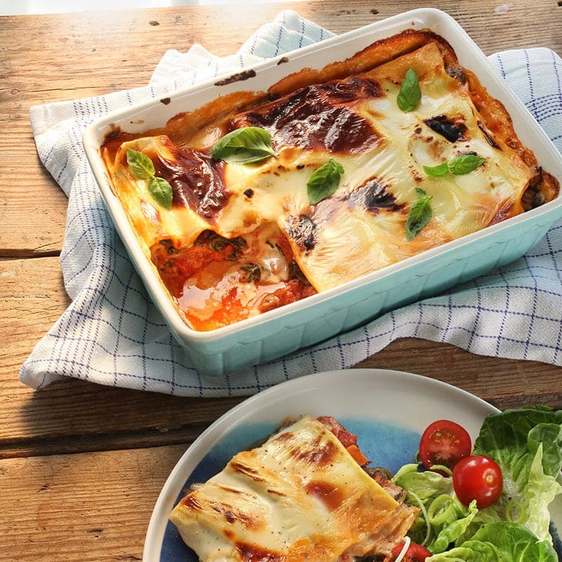 En lakto-ovo-vegetarisk lasagne fylld med svamp, spenat och tomat. Servera med en sallad. Mums!