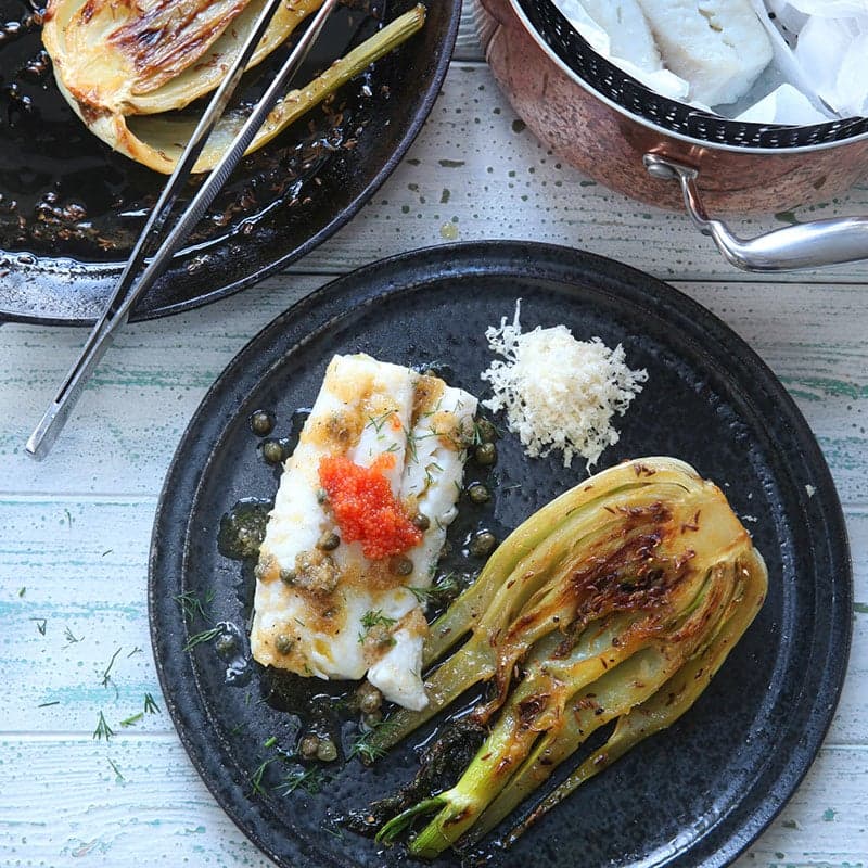 Kombon av en härlig bit torsk och brynt smör är oslagbar. Det här receptet kan tyckas vara mer en helgrätt än en vardagsrätt, men är så enkel att göra så det är vilket som. Serveras här med honungsglacerad fänkål som får smak av kummin.