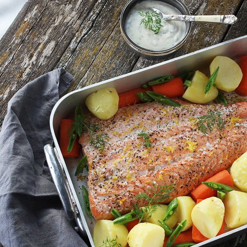 Ugnsbakad lax täckt med vin- och dillsås. Smaskens för hela familjen!