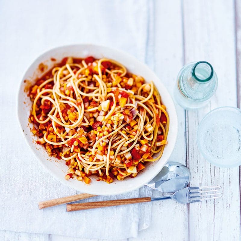 Det finns idag en uppsjö av praktiska vegetariska köttsubstitut i affärerna. I denna bolognesen har vi dock valt att inte använda ett av dessa. Här är det linser, morot och selleri som står för "köttigheten" och det smakar bara såå gott!