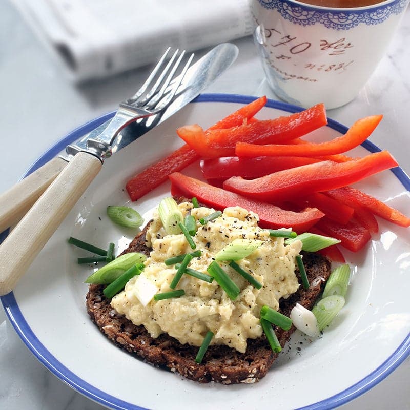 Strimla paprika och salladslök. Vispa samman ägg och vatten, krydda med salt och peppar. Hetta upp olja i en kastrull och häll i äggsmeten. Stek på medelvärme under omrörning till en krämig röra. Lägg upp äggröran på brödet, strö över hackad gräslök och servera. Tips! Servera gärna med några skivor skinka