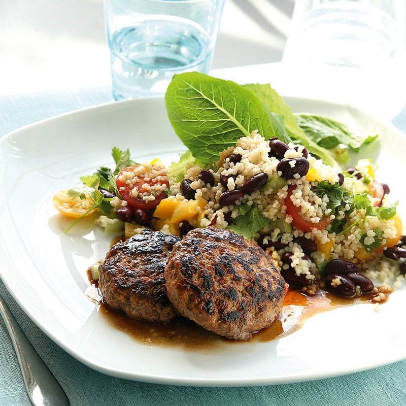 En härligt färgsprakande couscoussallad till en färsbiff med mycket smak av vitlök, ajvar och koriander.