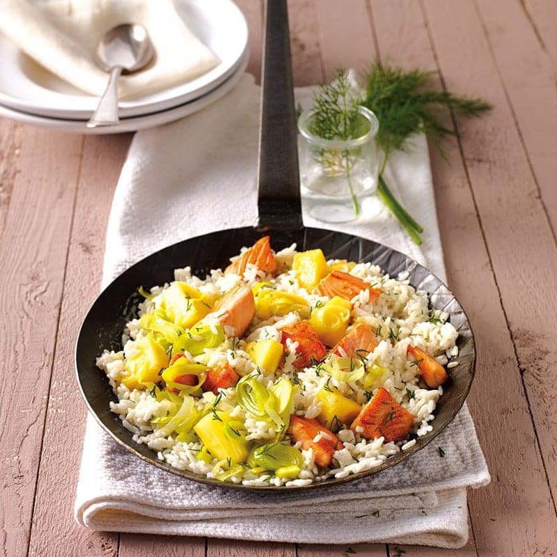 Koka riset. Dela laxen i kuber och strimla purjolöken. Stek laxbitarna ett par minuter i olja. Ta upp laxbitarna och håll dem varma. Fräs purjon 1- 2 min, häll på buljong och låt det sjuda sakta ca 5 min. Vänd ner ris, lax, ananasbitar, yoghurt och dill. Låt allt bli varmt. Smaka av med salt, peppar och pressad citron. Tips! Byt ut laxen till 125 g kycklingfilé.