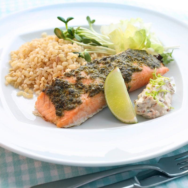 Lax och pesto är en utsökt smakkombination. Laxen tillagar sig själv medan du förbereder en kall sås. Servera med bulgur och sallad.