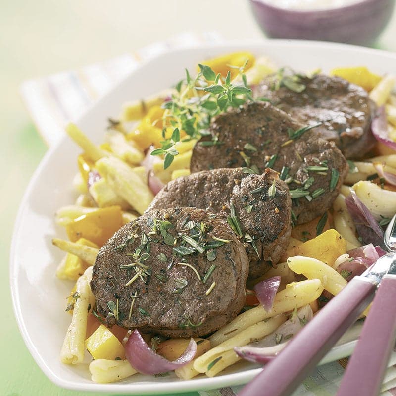 Skala och skär rotfrukter, lök och paprika i mindre bitar. Lägg alltsammans på en bakpappersklädd plåt. Ringla över olja och blanda så att oljan kommmer jämt över. Krydda med pressad vitlök, flingsalt, rosmarin och svartpeppar. Skär filén i fyra jämna bitar. Krydda dem väl med salt och peppar. Låt köttet bli rumstempererat och bryn det runt om i margarin. Lägg filébitarna över grönsakerna, stek i ugn 200 grader ca 15 minuter. Ta ut formen och blanda ner pastan, stek ytterligare ca 10 minuter. Blanda samman fraiche med din favoritkrydda, låt stå i kyl för att mogna en stund. Servera rotfruktssalladen med filé och toppa med fraiche.