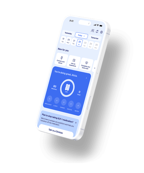 Medication shown not representative of actual product, which is dispensed by a licensed pharmacy. Programs do not include the cost of GLP-1 medications. All medications require eligibility and a prescription. All medical services are provided through our affiliated medical group, WeightWatchers Clinic.