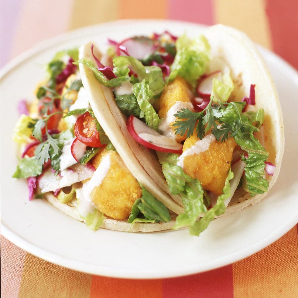 This casual street food is everywhere in Baja, Mexico. The fish is usually deep-fried, but we oven-fried it for a healthier crunch. You won't miss anything in terms of flavor or texture since the fish is coated in masa corn flour that's seasoned with salt, black pepper, cayenne pepper, garlic powder, and paprika. We call for red snapper, but feel free to use grouper, halibut, or trout instead. These tacos also feature a salad of romaine lettuce, radishes, scallions, tomatoes, and cabbage, plus a creamy sauce made up of yogurt, lime juice, and chipotle peppers. They take a little more time to put together than traditional tacos, but you'll love the payoff.
