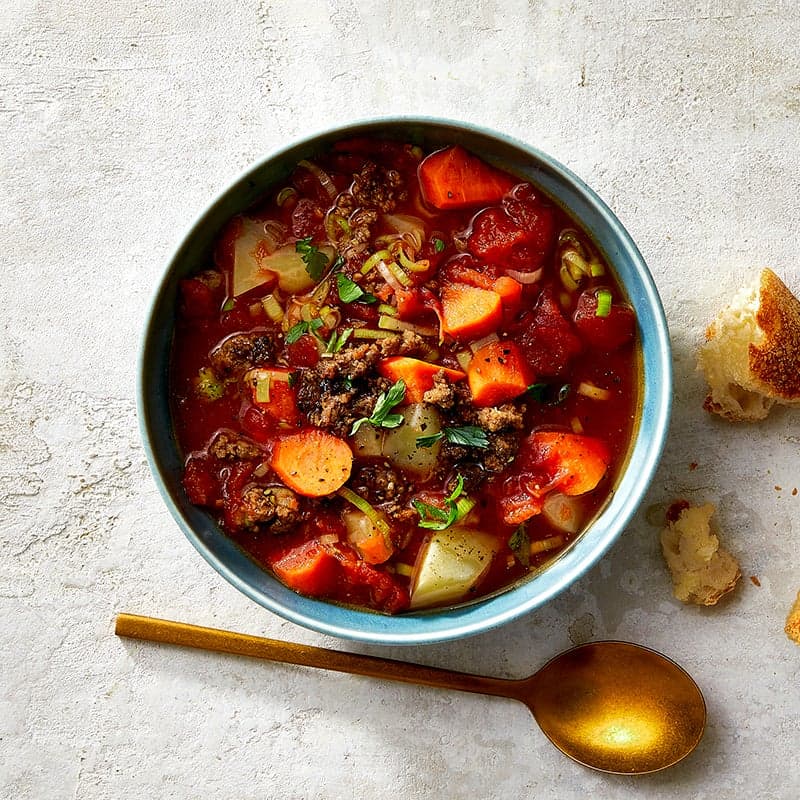 Heat the oil in a Dutch oven over medium-high. Add the beef, salt, paprika, and ½ tsp black pepper; cook until the beef is browned, 5 to 6 minutes, stirring frequently to crumble. Stir in the beef stock, leeks, potatoes, carrots, and tomatoes; bring to a boil. Cover, reduce the heat to medium-low, and simmer until the vegetables are tender, 15 to 20 minutes. Sprinkle with the parsley and remaining ¼ tsp black pepper.