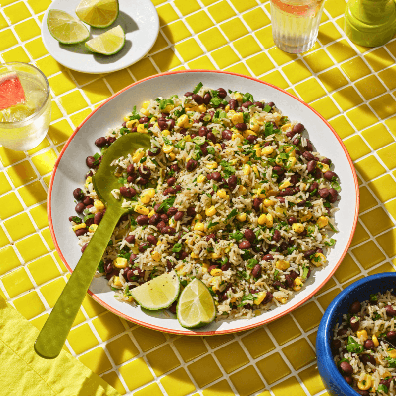 Stir in beans, corn, scallions, cilantro, jalapeño, lime juice, and zest; season to taste with salt and pepper. Serve with lime wedges.