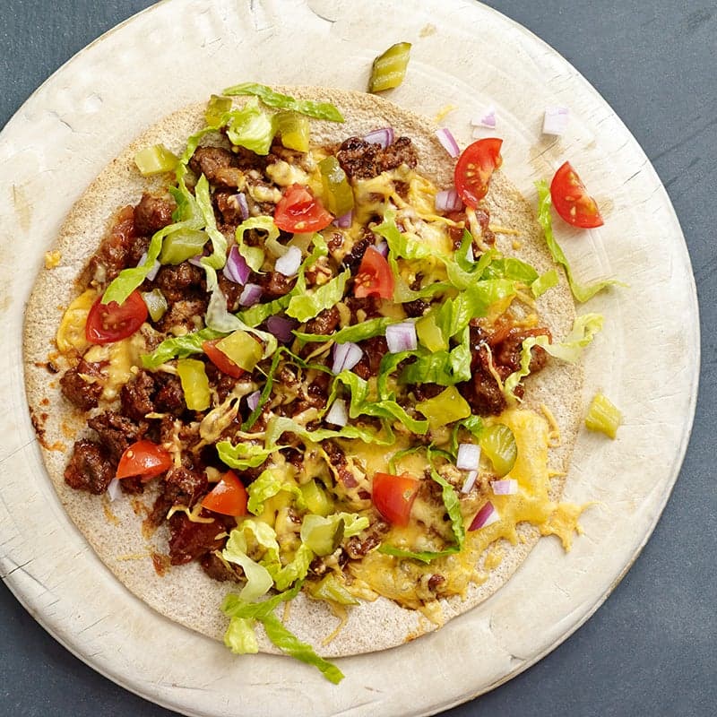 This quick, weeknight recipe morphs everyone’s two all-time favorites into one tasty dish. Piled high with lettuce and tomatoes these thin-crust pizzas can serve as a full meal. Using whole-wheat tortillas for the crust is the trick to making them at home pronto – they only need to bake in the oven about 5 to 7 minutes to get super-crisp. They come together even faster if you brown the ground beef and onion mixture and build your pizzas on baking sheets while the oven preheats. Ground beef gives this meal its signature burger flavor but ground turkey breast makes a good substitute if that’s what you have on hand.