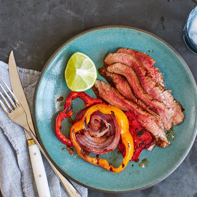Slice steak against grain; serve drizzled with juices from cutting board, grilled vegetables and a squirt of fresh lime juice.