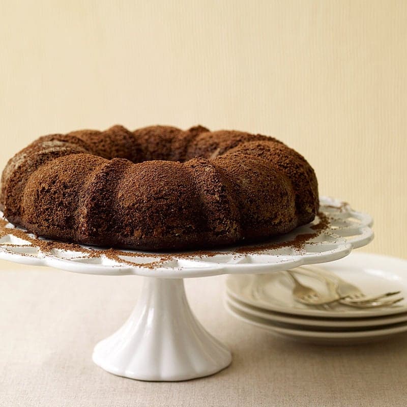 Pour batter into prepared pan; bake in center of oven until a tester inserted in center of cake comes out clean, about 55 to 60 minutes. Cool cake in pan for about 20 minutes and then turn out onto a baking rack to cool completely. Sprinkle with 1 teaspoon of cocoa powder before slicing into 14 pieces. Yields 1 slice per serving.