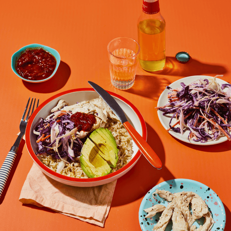 Sometimes the best busy-day meals are the ones that you assemble instead of cook. Here’s a great example: a rice bowl that you build from convenience foods—precooked rice, rotisserie chicken, packaged coleslaw mix, and salsa.